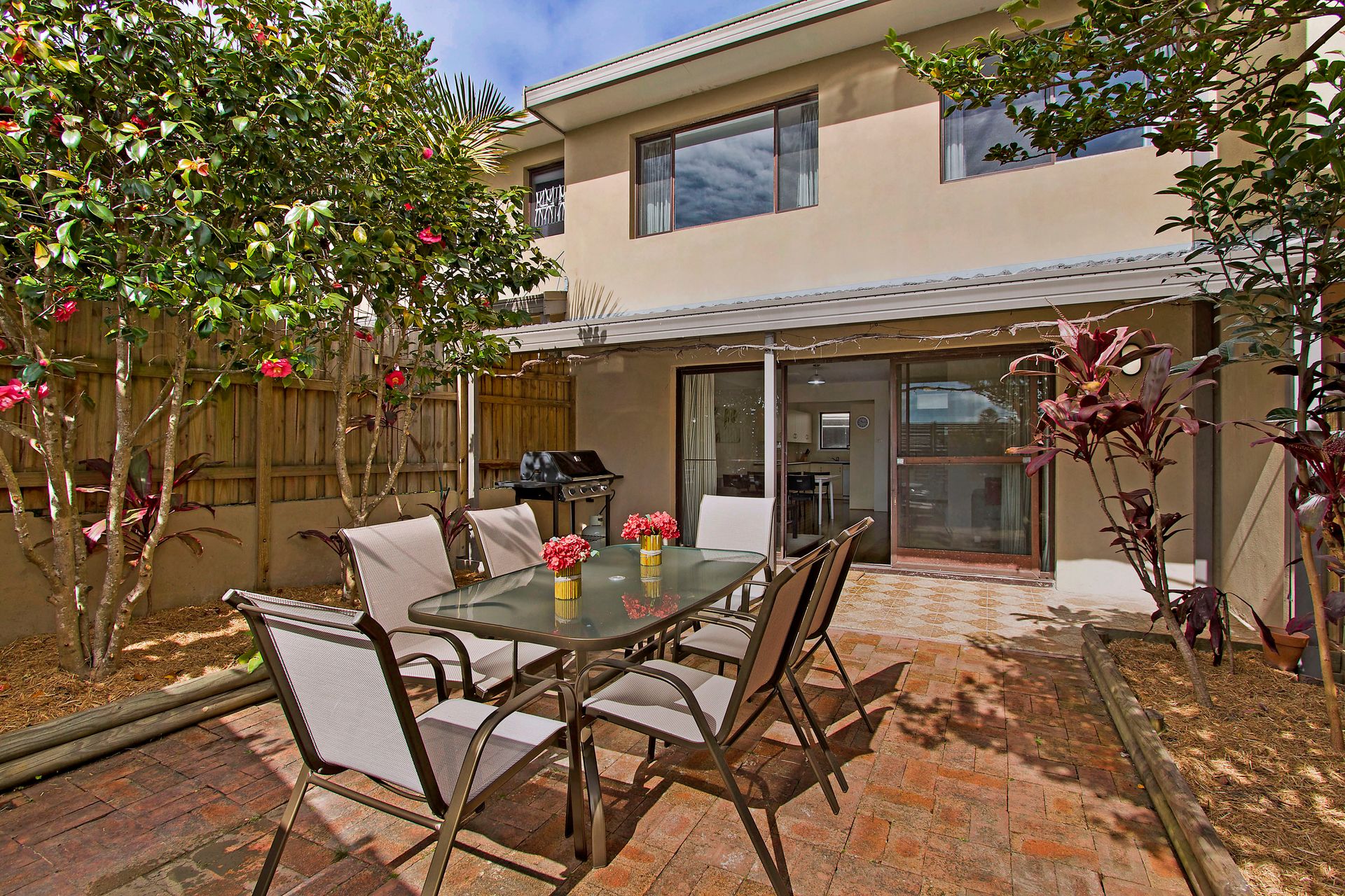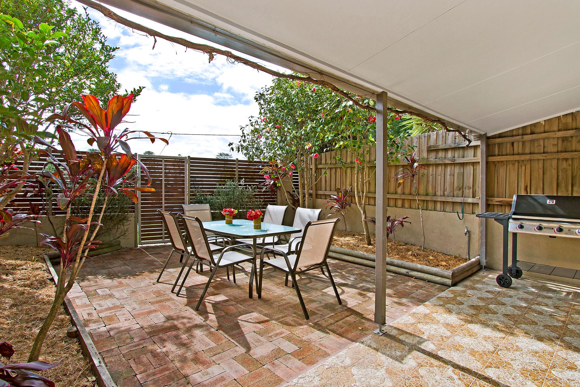 Sundrenched large leafy courtyard with outdoor setting & BBQ