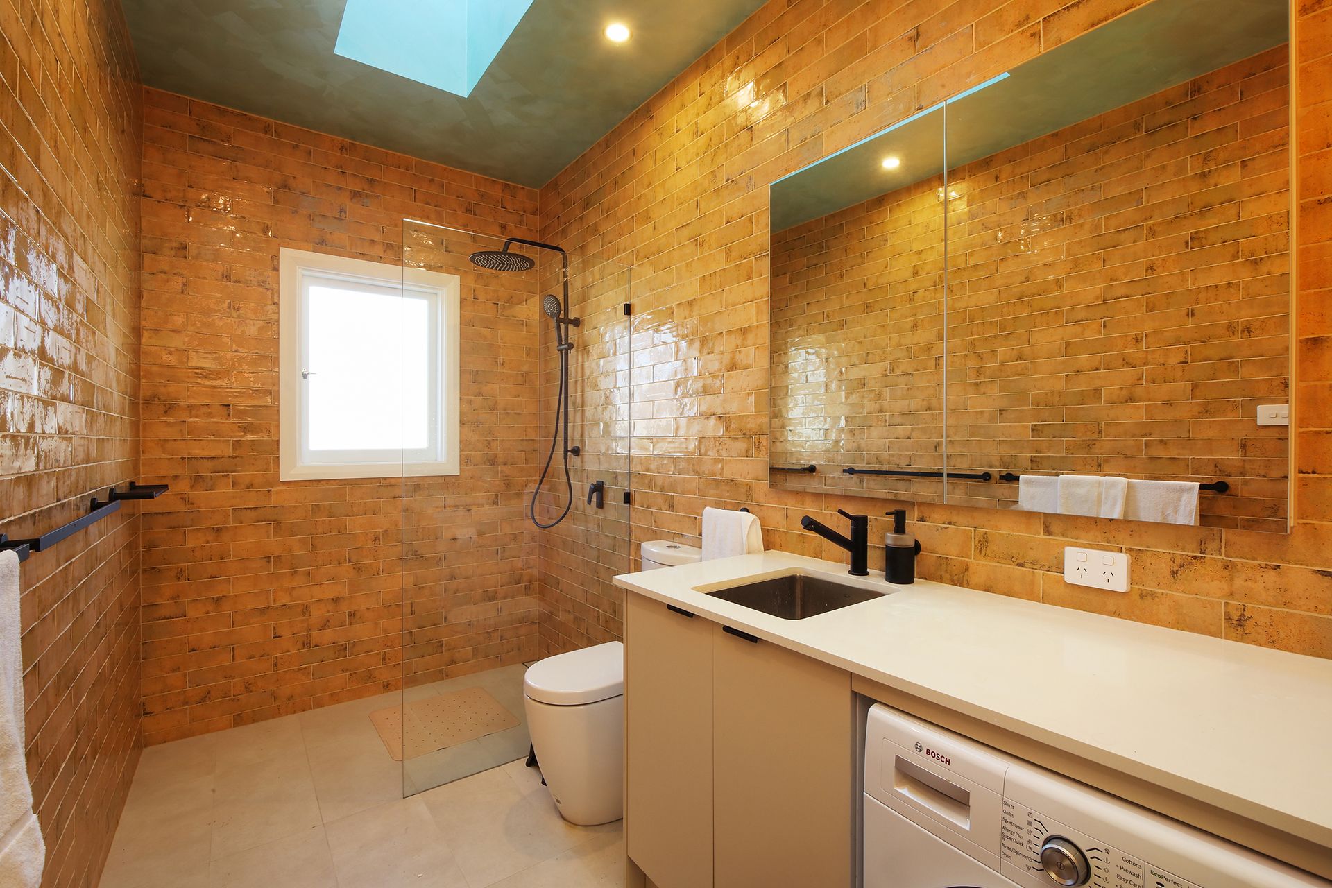 - Bosch washing machine/dryer in the bathroom with walk-in shower