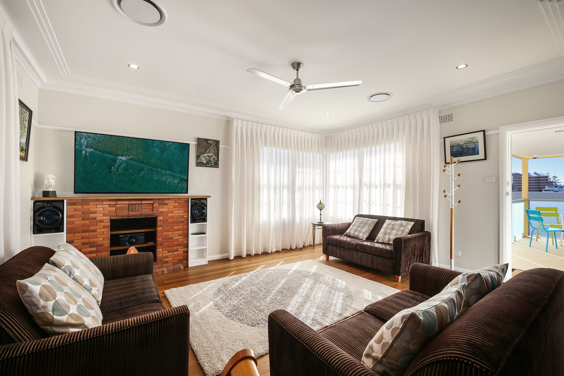 - Large flat screen 65" wall-mounted smart TV with ample lounging